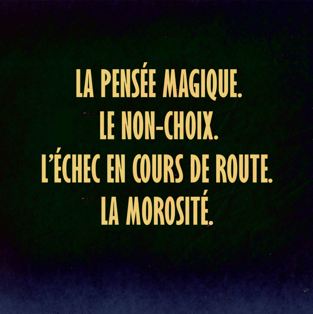 la pensée magique, le non-choix, l’échec en cours de route et la morosité.
